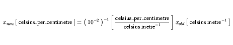 The expansion of the xold term, which has units that are a product, is not obvious. This term must be expanded to continue. metre is an SI base unit, so need not be expanded. However, celsius is an SI derived unit, the expansion of which is given in Equation 24. Because this expansion is to be substituted into a complex units definition, the offset term is dropped. The next step in the expansion makes use of the modified celsius definition in Equation 29 and the identity in Equation 30.